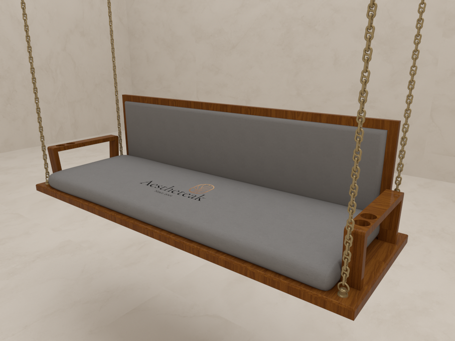 - At Aestheteak, we are dedicated to offering you unparalleled comfort and style with our handcrafted swings. Each Aestheteak piece is handcrafted and made to order. Due to the natural variations in wood grain and colour, your product may look slightly different from the image shown, ensuring a unique and high-quality piece. This Swing comes with cushions included. Please note that while we strive for accuracy, fabric colours may appear slightly different on various screens. Rest assured, we promise the actual product will be as close as possible to what you see. The design of brass chains show in the image are subjected to vary based on availability. Rest assured the quality of chain provided is of the highest grade of brass to withstand the weight of at least 300 kgs. To hang the swing provisions must be made at the site/home/location to put it up. Service provided by Aestheteak ends with providing the swing and chain. In the final product, the Aestheteak branding, as depicted in the image, will not be so bold. Each product will have a small, subtle embossed logo serving as a hallmark of unparalleled quality and craftsmanship.