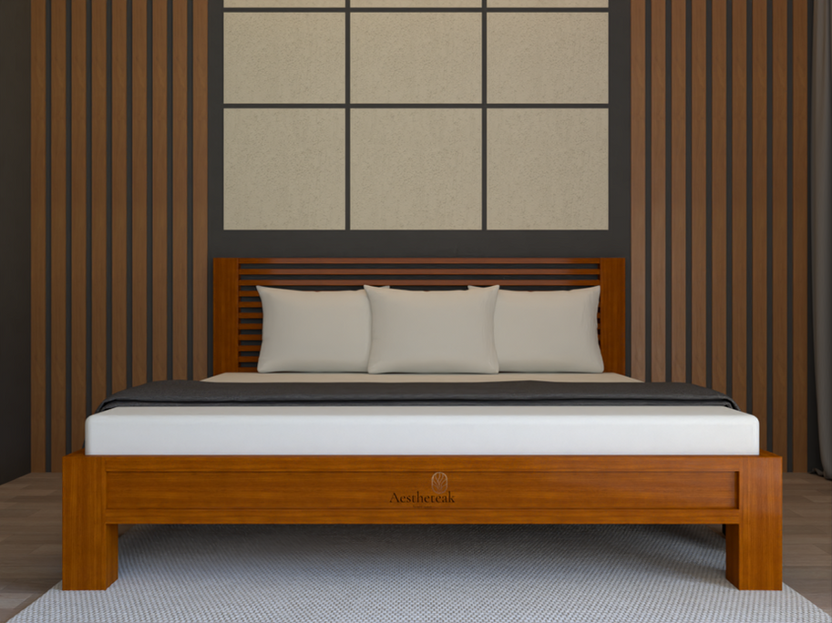 - At Aestheteak, we understand that a good night’s sleep is essential and that mattress preferences are highly personal. Therefore, our beds do not come with mattresses. However, we are happy to assist you in finding the perfect mattress. Please contact Aestheteak Studio with your needs, and a team member will get back to you promptly. Each Aestheteak piece is handcrafted and made to order. Due to the natural variations in wood grain and colour, your product may look slightly different from the image shown, ensuring a unique and high-quality piece. Additionally, fabric colours and textures may appear differently on various screens, but we guarantee they will be as close as possible to what you see. In the final product, the Aestheteak branding, as depicted in the image, will not be so bold. Each product will have a small, subtle embossed logo serving as a hallmark of unparalleled quality and craftsmanship.